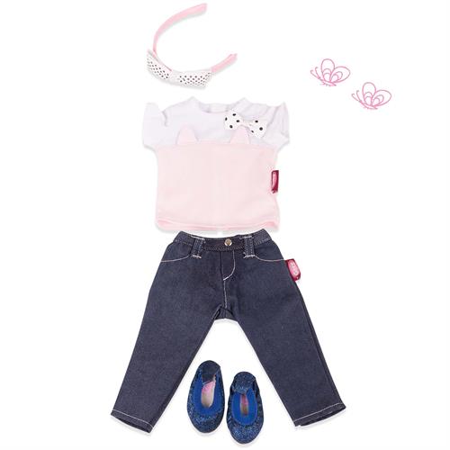 Varekort Götz dukketøj jeans med bluse, sko og hårbøjle 36 cm.