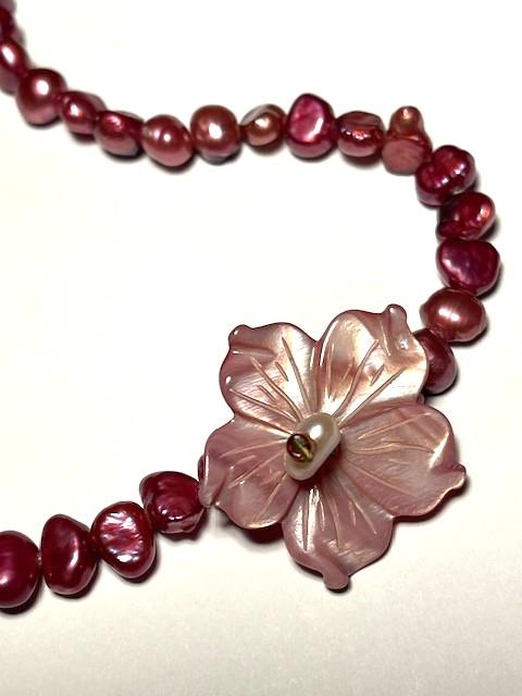 Meget smuk halskæde med bordeaux ferskvandsperler og flot perlemorsblomst.