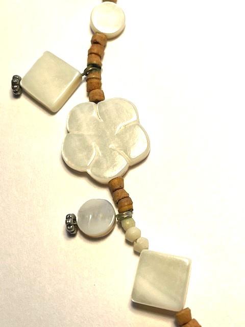 Flot halskæde med små fine kvadratiske og runde perlemorsperler + lyse benperler, små brune træperler og små forsølvede blomster.
