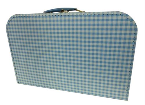 Blå lys og hvid ternet 35 cm papkuffert til børn i kraftig kvalitet. Kufferten har et praktisk håndtag, så den er nem at tage med, den lukkes med metalspænde. Kufferten er også meget velegnet til sprogkuffert og sangkuffert.
