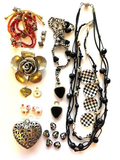 2 halskæder med sorte perler + naturperler. Flotte store vedhæng hjerte og blomst. Små vedhæng 2 rosa hunde en marguerit en lille hjerte med "I love you" Sprunget halskæde med hjerte, sorte perler samt forsølvede perler. Flotte cloisonne hjerter sorte med blomsterdeco. mm,