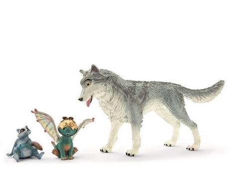 Meget flotte detaljerede figurer fra Schleich med ulven Lykos, den søde vaskebjørn Piuh og den lille dragebaby Nugur. Figurer fra Schleich Bayala filmunivers.